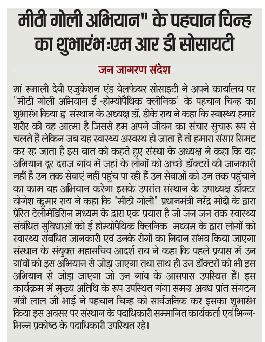 स्वास्थ्य जागरूकता अभियान समाज को स्वस्थ, सशक्त और जागरूक बनाने की दिशा में एक महत्वपूर्ण कदम है। यहाँ एक प्रभावशाली संदेश है जिसे Maa Rumali Devi Education and Welfare Society या मीठी गोली अभियान (ई-होम्योपैथिक क्लिनिक) के तहत उपयोग कर सकते हैं: